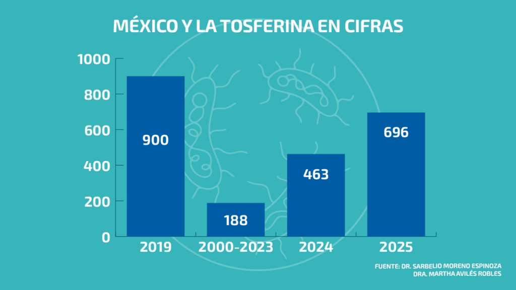 Hasta 2019, el número de casos de tosferina que cada año se registraban en el país eran un promedio de 900. No obstante, para 2000 los números tuvieron un descenso debido a la pandemia de COVID-19. Según la Secretaría de Salud, esta baja en la notificación se sostuvo hasta el año 2023 en el que se registraron 188 casos confirmados, seguidos de 463 casos confirmados en el año 2024.