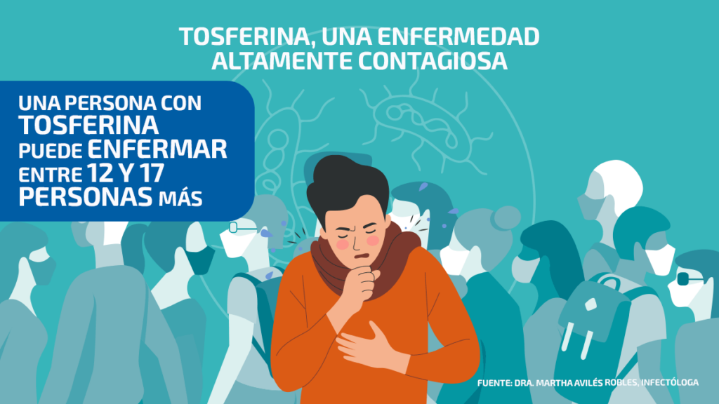 La infección por Bordetella pertussis, bacteria causante de la tosferina puede provocar una infección respiratoria aguda altamente contagiosa. En conferencia de prensa, Martha Avilés Robles aseguró este martes, que una persona con tosferina puede infectar entre 12 y 17 personas. A pesar de ello es una enfermedad completamente previble mediante la vacunación.