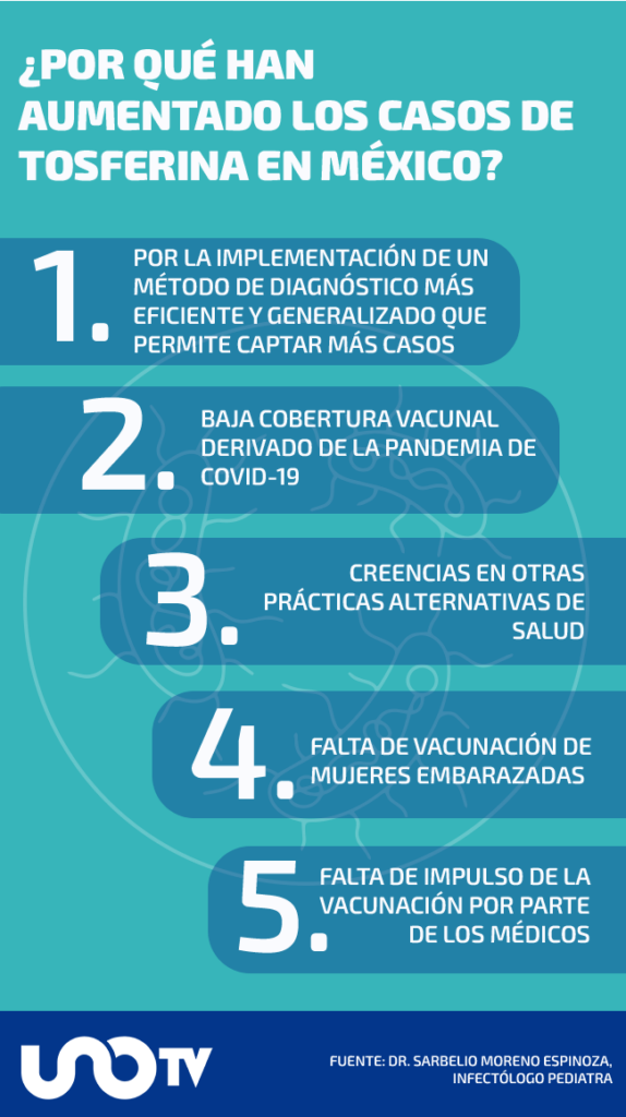 El motivo por el que actualmente existe un aumento en el número de casos de tosferina en México es multifactorial, indicó Sarbelio Moreno Espinosa, infectólogo pediatra en entrevista con Unotv.com.