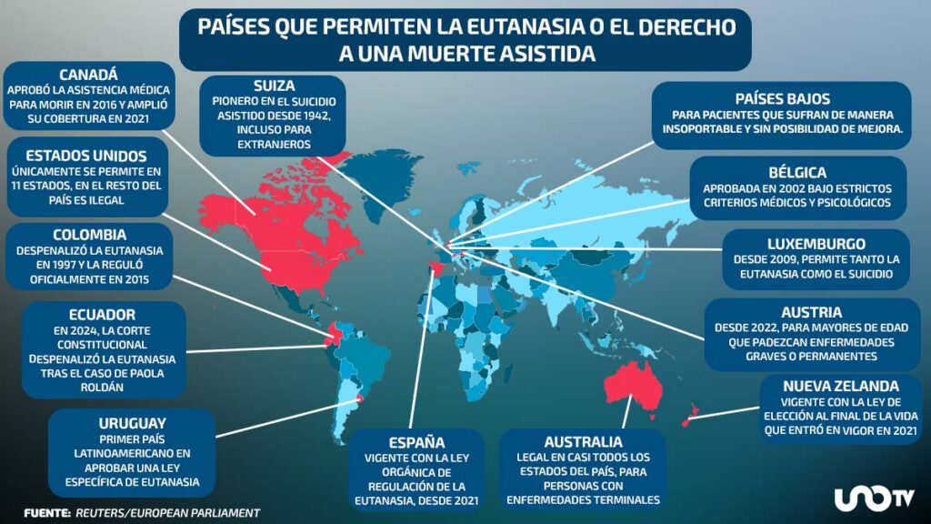 En 2025, Uruguay se convirtió en el primer país latinoamericano en aprobar una ley específica de eutanasia, llamada “Muerte digna”, que autoriza el procedimiento en adultos con enfermedades incurables o sufrimiento irreversible.