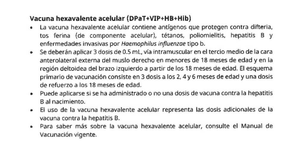 - Vacuna hexavalente acelular, que protege contra difteria, tétanos, tosferina (pertussis), hepatitis B, Haemophilus influenzae tipo B y poliomielitis