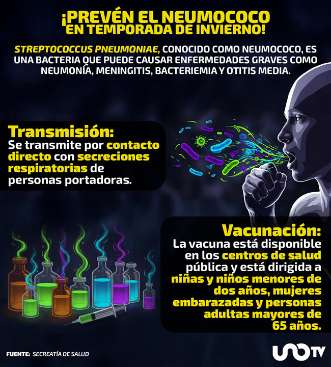 La Secretaría de Salud (SSA) llamó a la población mexicana a vacunarse para prevenir enfermedades causadas por el neumococo, una bacteria que puede generar complicaciones graves y derivar en meningitis y neumonía, especialmente durante la temporada invernal.