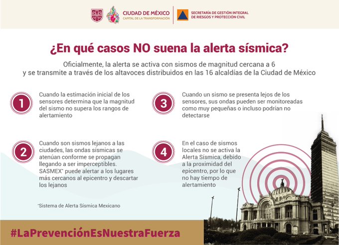 La Secretaría de Gestión Integral de Riesgos y Protección Civil (SGIRPC), resalta cuatro momentos clave en los que la alerta sísmica no suena: