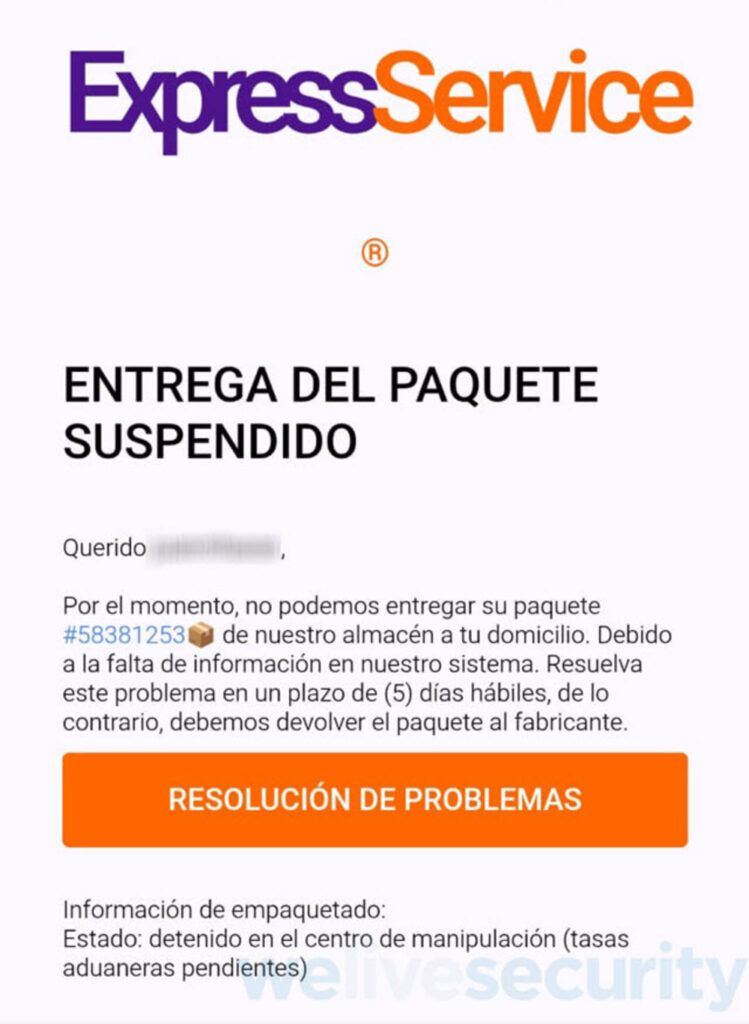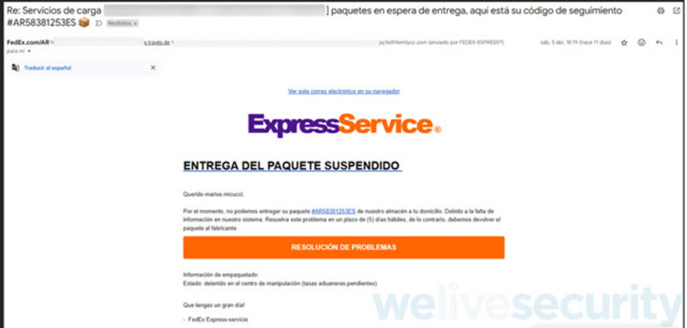 Aunque los atacantes suplantan a empresas reales, ESET encontró que los ciberdelincuentes también usan el nombre de una compañía de mensajería falsa llamada “ExpressService“, cuyo logo se parece mucho al de FedEx.