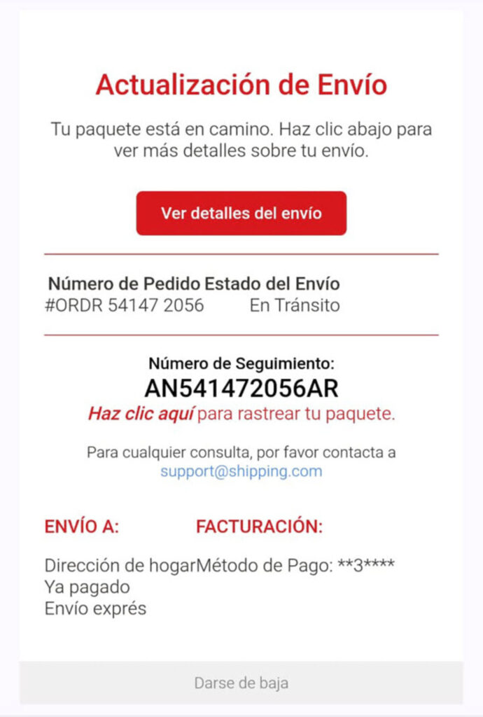 Otra técnica utilizada es la supuesta actualización del envío, que consiste en que los ciberatacantes insten a las personas a ver los detalles, para conocer el estado de la entrega.