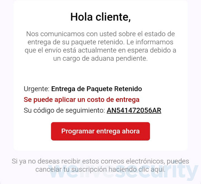 En esta modalidad, un cargo en la aduana estaría demorando la entrega del supuesto paquete. De esta forma, los atacantes roban información y además obligan a sus víctimas a realizar un pago que llegará a las cuentas de los perpetradores.
