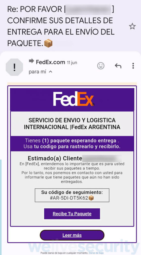 Otro caso identificado por la compañía de seguridad digital suplanta directamente la identidad de FedEx, a diferencia del primer ejemplo en el que simulaban ligeramente su apariencia sin usar su nombre directamente.