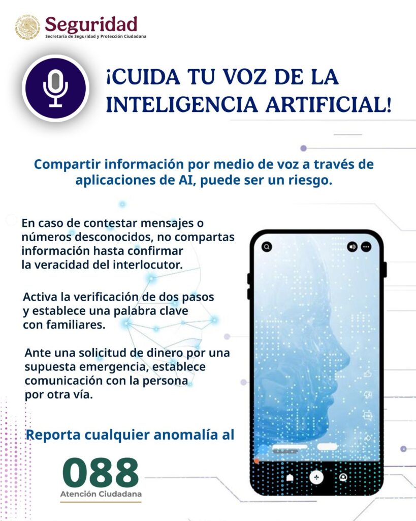 La Dirección General de Gestión de Servicios, Ciberseguridad y Desarrollo Tecnológico de la SSPC señaló que, a fin de no caer en un fraude o estafa con IA, es importante: