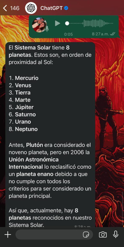 - Responder preguntas: Si en la nota de voz se le hace alguna pregunta o se le comparte un tema, puede ofrecer una respuesta o explicaciones basadas en lo que menciona el usuario.
