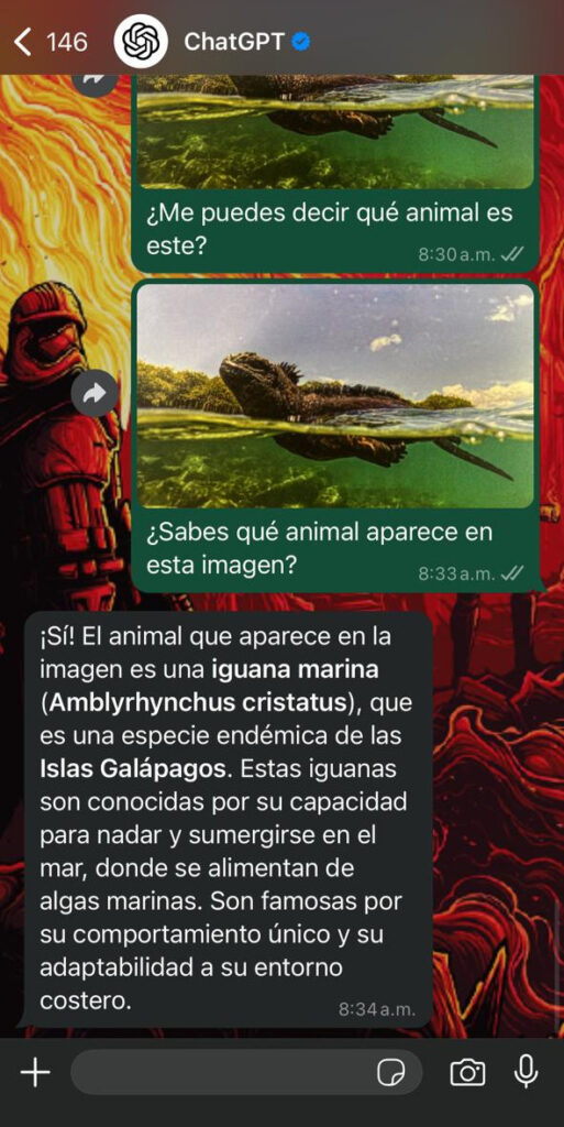 Se le envió la fotografía de un reptil nadando preguntándole de qué animal se trataba y, a pesar de que la aplicación estaba actualizada a su versión más reciente y en teoría la función debía estar disponible para los usuarios de todo el mundo, ChatGPT no ofreció una respuesta.