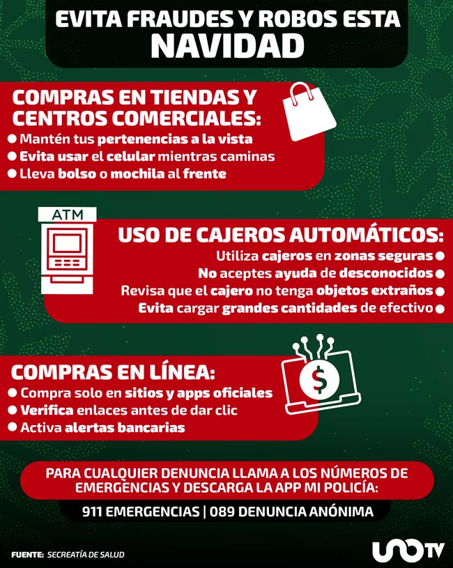 A través de una publicación en Facebook bajo el lema “Esta Navidad, tu seguridad es el mejor regalo”, las autoridades capitalinas exhortaron a la ciudadanía a extremar precauciones al salir de casa, realizar compras y utilizar servicios bancarios, con el objetivo de disfrutar las celebraciones sin contratiempos.