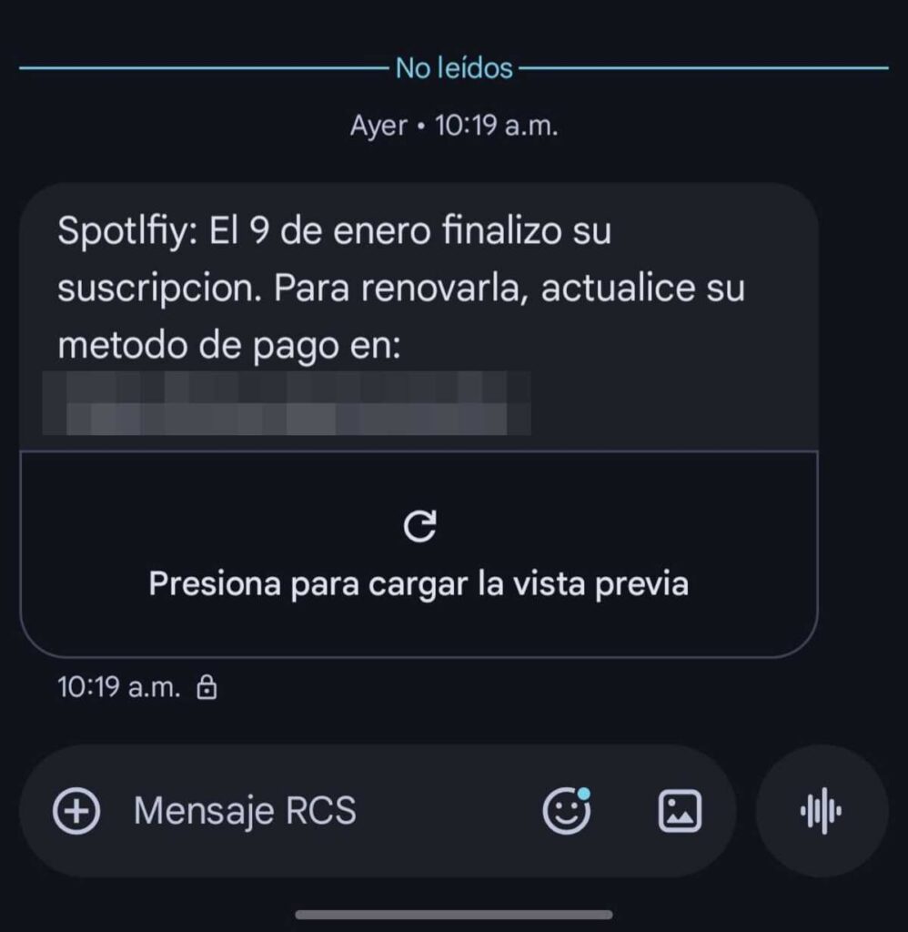 En el caso de los mensajes que suplantan a Spotify, se presentan múltiples rasgos de phishing o smishing, que es como se le conoce particularmente a la práctica a través de SMS.