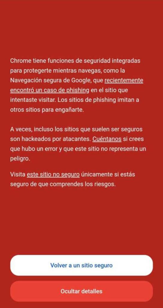 Por su parte, Google Chrome emite la siguiente advertencia: “Es posible que los atacantes del sitio que has intentado visitar te engañen para que instales software o proporciones información como tus contraseñas, tu teléfono o tus números de tarjeta de crédito”.