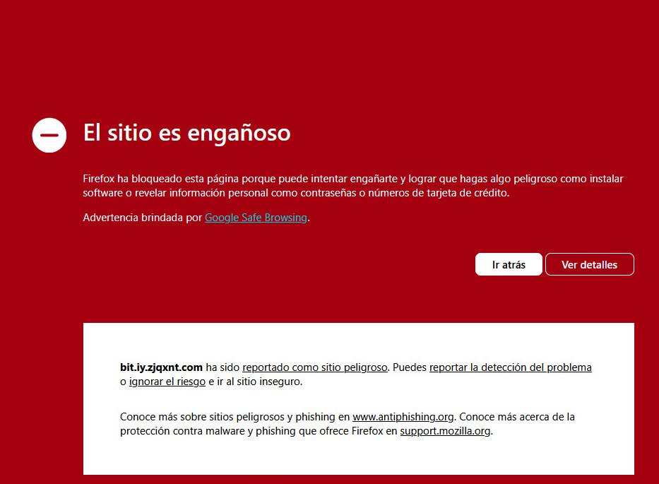 Actualmente, el sitio al que redirige el mensaje ya fue bloqueado por los navegadores web. Por ejemplo, Firefox advierte:
