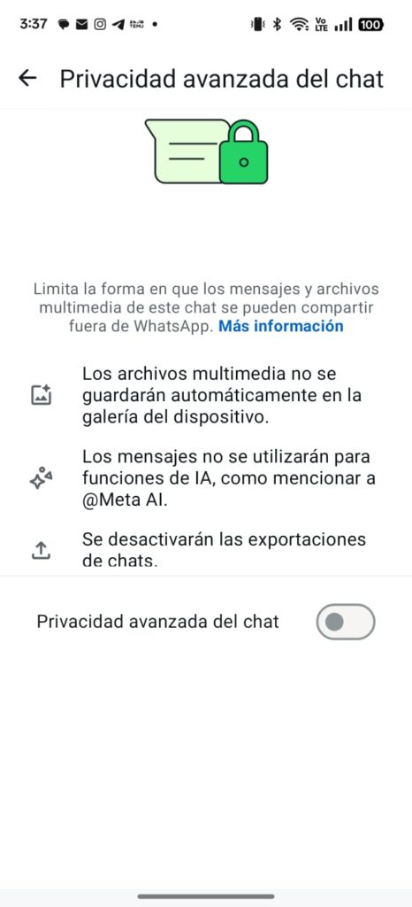 Una vez que lo hagas, los archivos multimedia no se guardarán automáticamente en la galería del dispositivo; además, los mensajes no se utilizarán para mencionar a @MetaAI, y se desactivarán las exportaciones de chat.