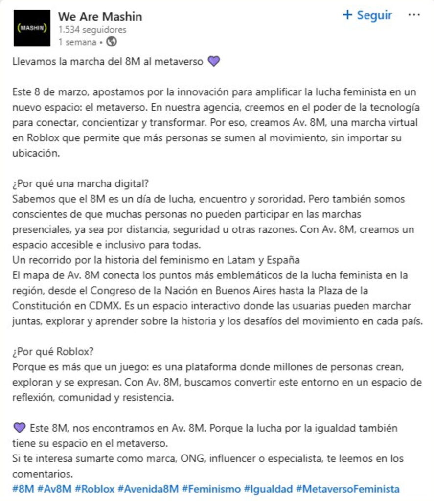 Mashin, red de agencias y empresas que opera en países como Argentina y México, organizó “Av. 8M“, la primera marcha virtual por el 8M a través de Roblox, con el objetivo de llevar esta manifestación al espacio digital, según dijo la agencia en LinkedIn.
