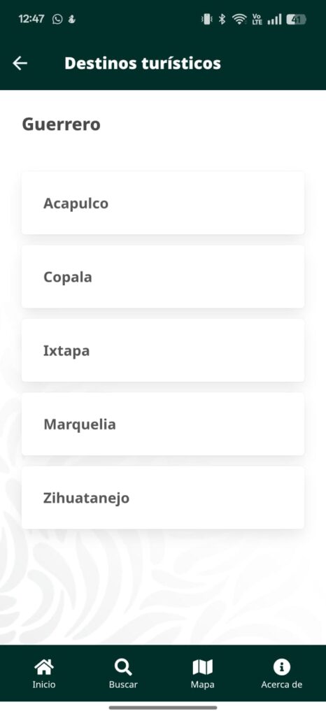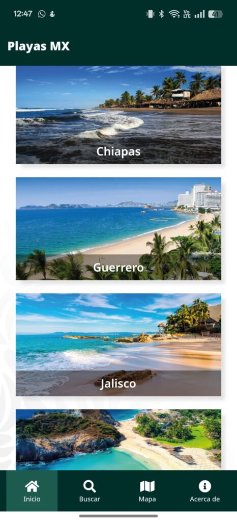 Luego de descargar la app, se desplegará un menú con los estados de México que tienen playas, estos son: