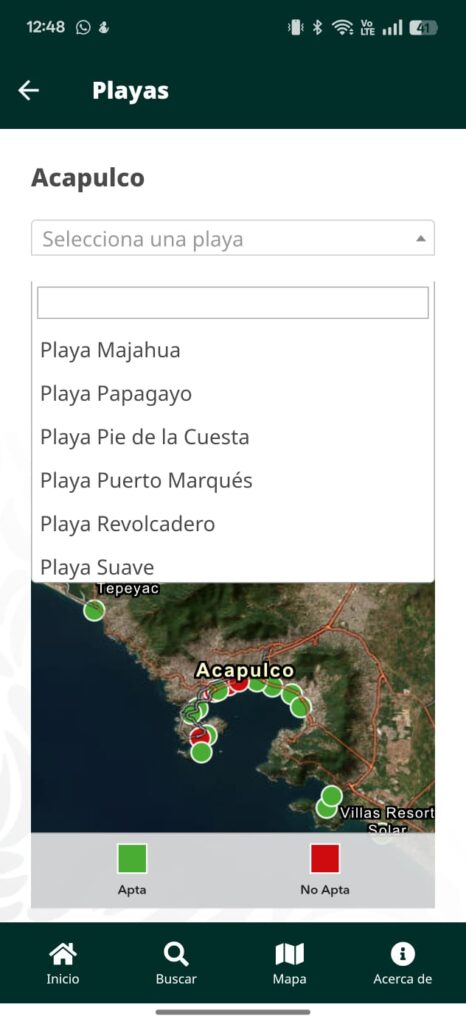 - Selecciona el municipio en el que se encuentra la playa que deseas consultar, en este caso, Acapulco