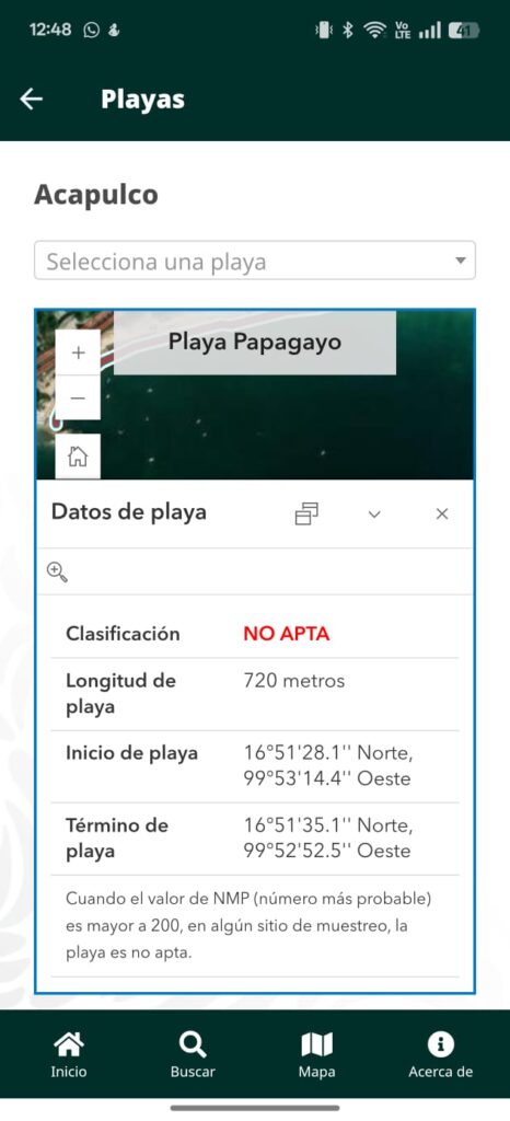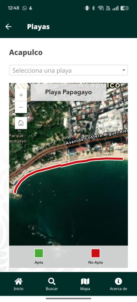 En cuanto selecciones la playa de tu preferencia, verás una línea verde si es apta o roja si no es apta. En el caso de la playa Papagayo, no es apta.