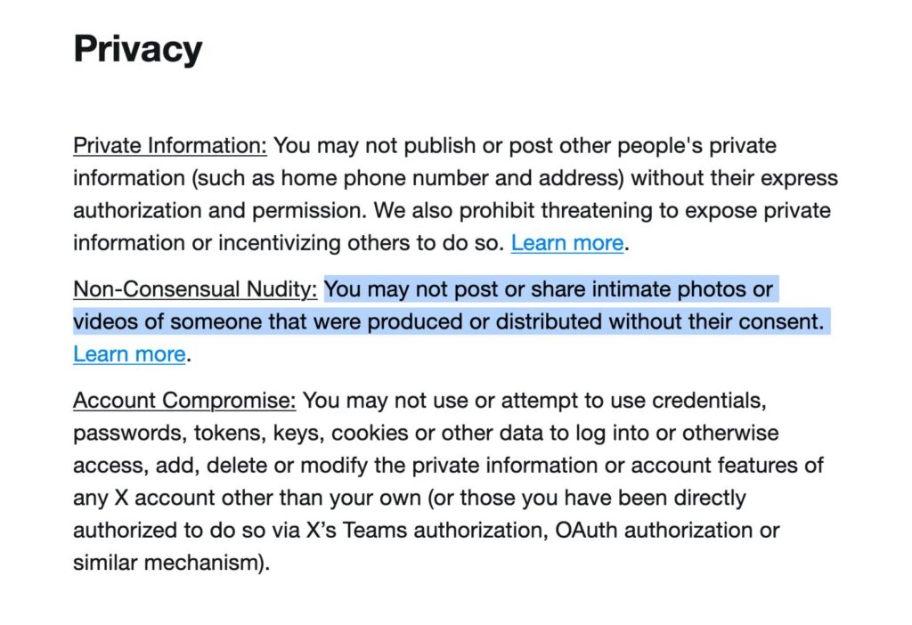 Por su parte, las reglas de X tienen una política específica de Non-Consensual Nudity (Desnudez no consentida) que prohíbe compartir imágenes o videos íntimos.