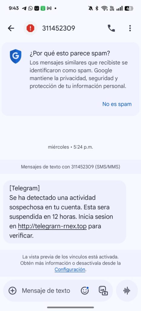 “[Telegram] Se ha detectado una actividad sospechosa en tu cuenta. Esta será suspendida en 12 horas. Inicia sesión en (link) para verificar”.