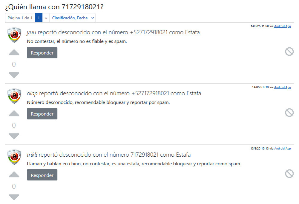 - “Llaman y hablan en chino. No contestar, es una estafa. Recomendable bloquear y reportar por spam”