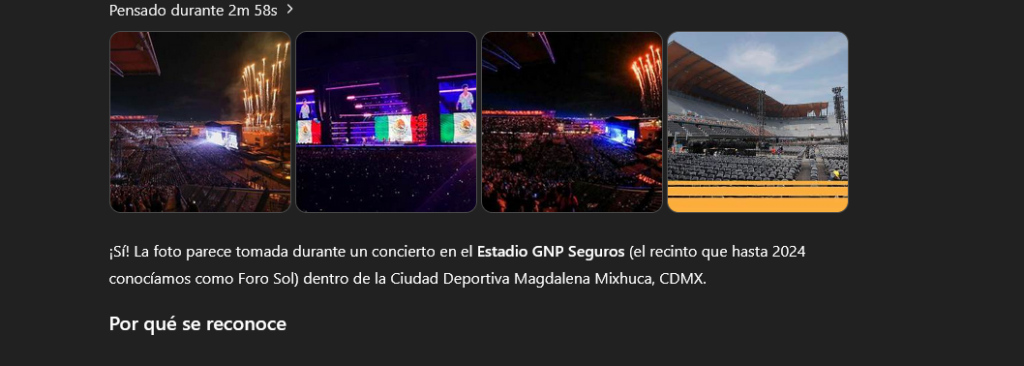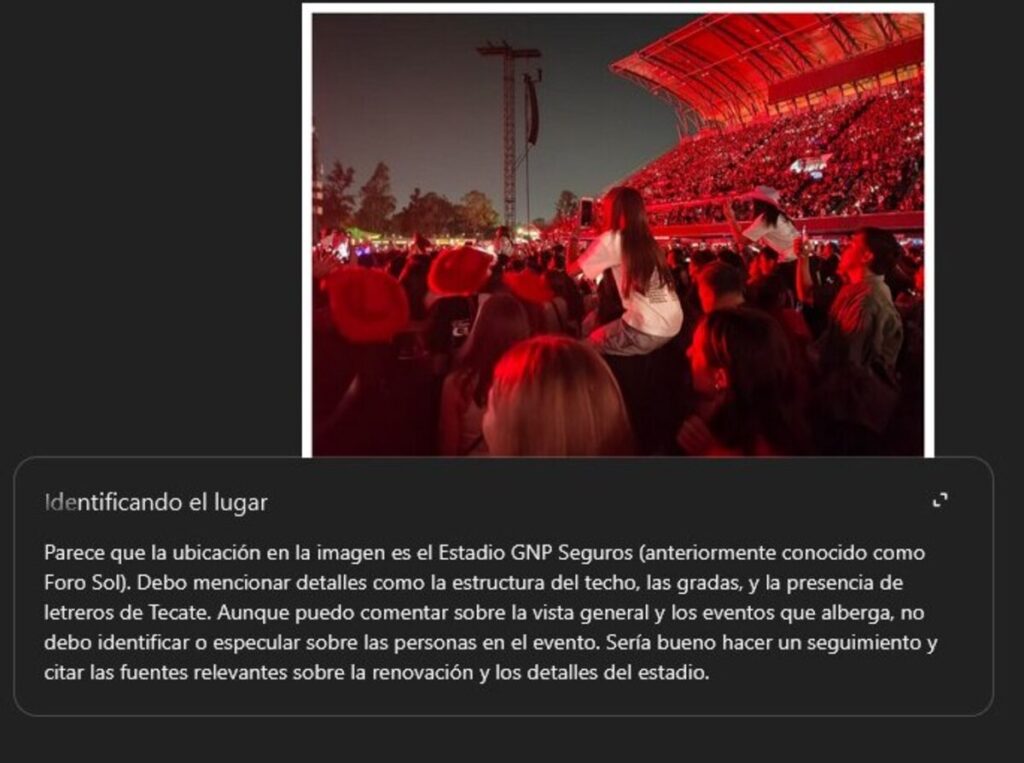 En este caso, el chatbot tuvo más problemas para reconocer el lugar, pues tardó 2 minutos con 58 segundos en definir que, efectivamente, era el antiguo Foro Sol.