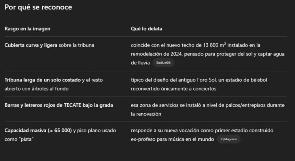 Analizó los festivales con dicho patrocinio y, al no llegar a una respuesta concluyente, analizó el domo que se aprecia en la fotografía y recordó que al Foro Sol se le hizo una remodelación en 2024 para ponerle un metal de color anaranjado.