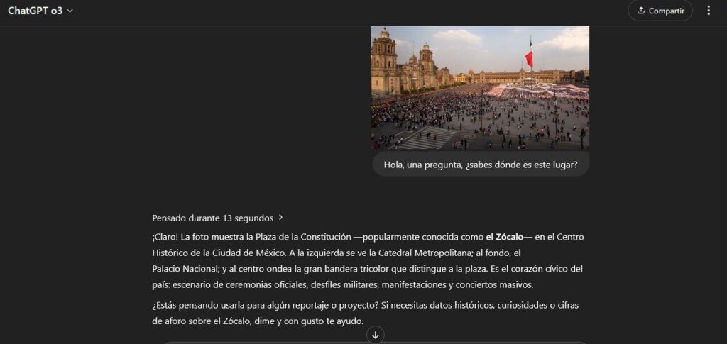 Un reportero de Unotv.com pidió a ChatGPT, en su modelo o3 que reconociera la plancha del Zócalo, a través de una imagen panorámica del lugar.
