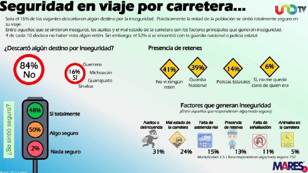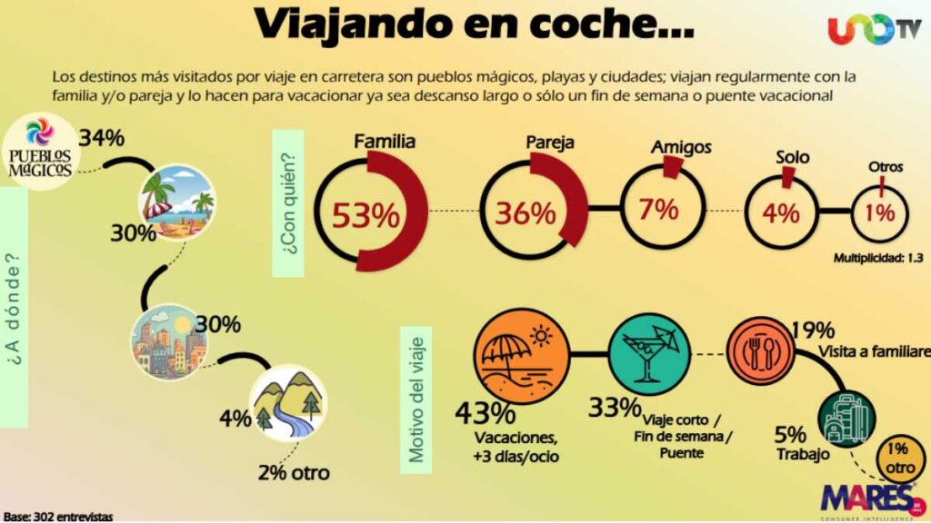 Los mexicanos siguen apostando por los viajes en carretera como su forma favorita para vacacionar. Así lo muestra un estudio de MARES para Uno TV, basado en 302 entrevistas a personas que realizaron un recorrido reciente en auto o camioneta por el país.