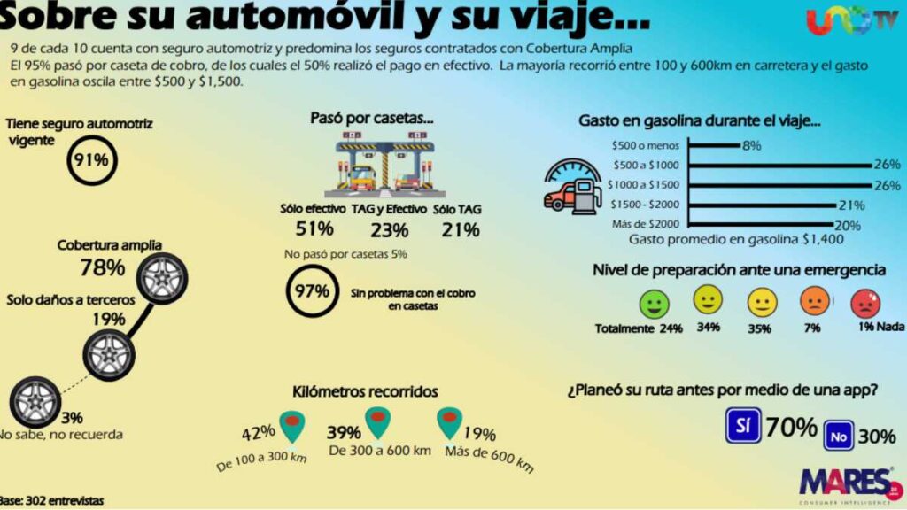 Además, 9 de cada 10 viajeros cuenta con seguro automotriz vigente, y 70% planifica su ruta con aplicaciones móviles, lo que demuestra un alto nivel de preparación.