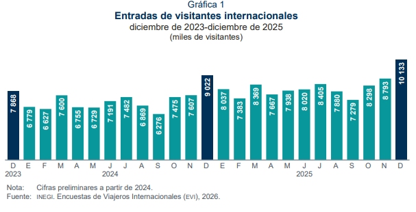 Durante diciembre de 2025 ingresaron al país 10 millones 132 mil 885 visitantes internacionales, lo que representó un aumento de 12.3% frente al mismo mes de 2024.